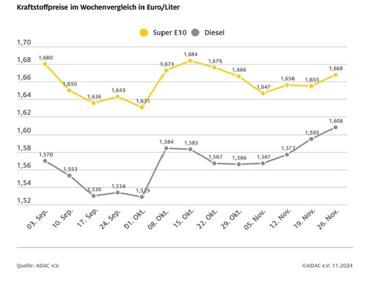 Aus Sicht des ADAC ist das derzeitige Preisniveau von Super E10 trotz der Verteuerung angemessen. Ein Blick auf die Preisauswertung vor vier Wochen zeigt einen nahezu identischen Benzinpreis (29.10.2024: 1,666 Euro je Liter Super E10) und das bei einem damals etwas geringeren Rohölpreis und einem deutlich stärkeren Euro.