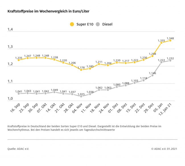 Benzinpreis klettert um 1,3 Cent, Diesel um einen Cent – Ursache ist gestiegener Ölpreis München (ots) – Nach dem kräftigen Preissprung zum Jahresbeginn ist Tanken in Deutschland binnen Wochenfrist erneut teurer geworden. Für einen Liter Super E10 müssen die Autofahrer derzeit im bundesweiten Mittel 1,348 Euro bezahlen, das sind 1,3 Cent mehr als vor einer…