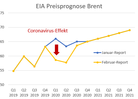 Das Coronavirus hat am Ölmarkt Eindruck hinterlassen: die „Energy Information Administration“ (EIA) der USA hat in ihrem vergangenen Monatsbericht eine sehr deutliche Korrektur ihrer Ölpreisprognose vorgenommen. Diese Korrektur beschränkt sich zwar erst einmal nur auf das erste und zweite Quartal diesen Jahres, dennoch ist sie deshalb nicht weniger deutlich. Wie in der Grafik zu sehen…