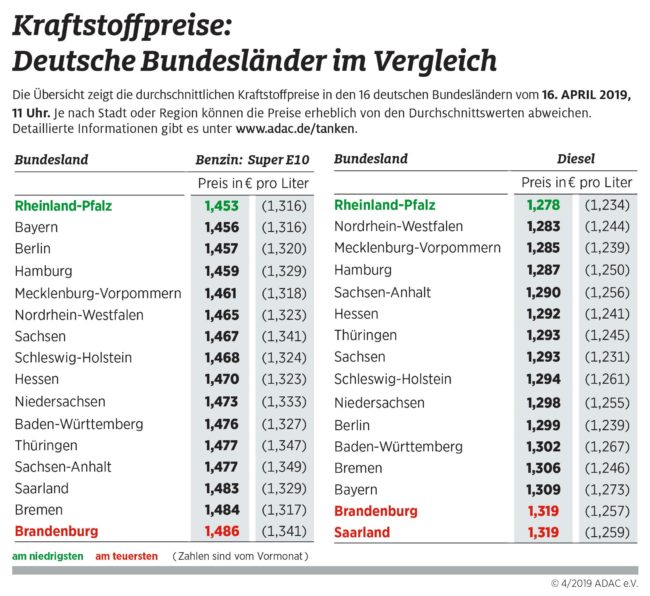 München (ots) Die Durchschnittspreise für Benzin und Diesel in den Bundesländern weisen vergleichsweise geringe Unterschiede auf. Am günstigsten tanken Autofahrer derzeit in Rheinland-Pfalz: Ein Liter Super E10 ist hier mit durchschnittlich 1,453 Euro um 3,3 Cent billiger als im teuersten Bundesland Brandenburg (1,486 Euro). Ein Liter Diesel kostet in Rheinland-Pfalz im Mittel 1,278 Euro, immerhin 4,1…