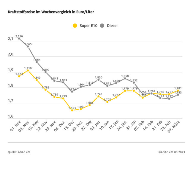 ADAC: Benzin und Diesel wieder teurer – Die Preise beider Kraftstoffsorten steigen gegenüber Vorwoche – Preisdifferenz zwischen Benzin und Diesel wieder etwas kleiner