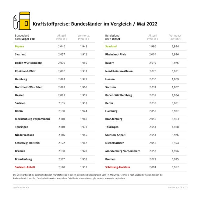 München (ots) – Innerhalb Deutschlands gibt es derzeit erhebliche Preisunterschiede an den Zapfsäulen. Das zeigt die aktuelle ADAC Auswertung der Kraftstoffpreise in den 16 Bundesländern. Die höchsten Spritpreise müssen aktuell die Autofahrer in Schleswig-Holstein und in Sachsen-Anhalt bezahlen. Am preiswertesten tankt man in Bayern und im Saarland.   Super E10 ist in Bayern mit 2,046…