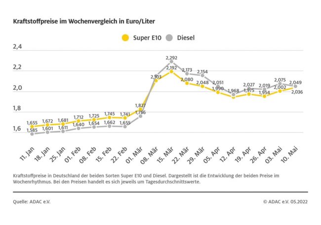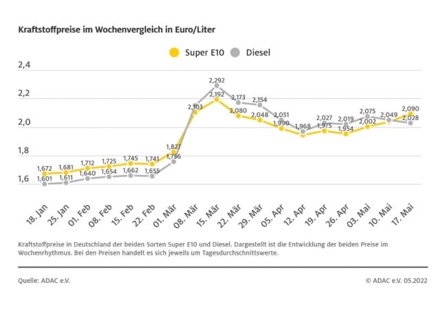 ADAC: Starker Preisanstieg an den Zapfsäulen – Beide Kraftstoffsorten kosten mehr als zwei Euro – Super E10 verteuert sich um 4,8 Cent, Diesel um 5,6 Cent
