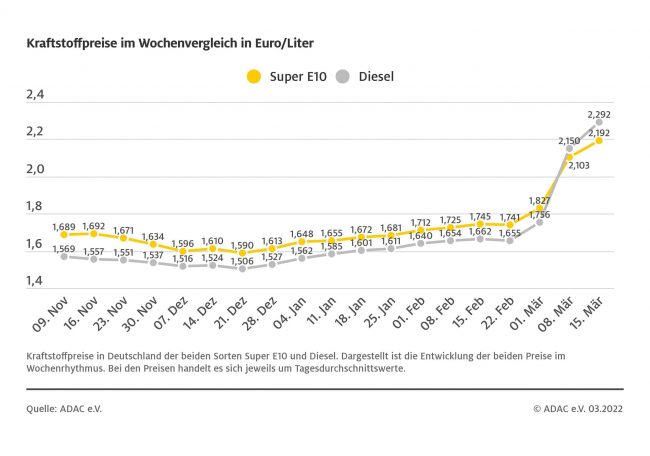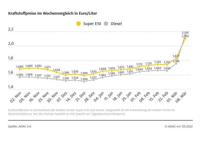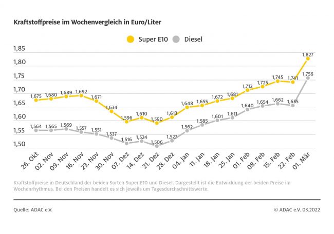 München (ots) – Der Anstieg der Kraftstoffpreise hat sich in der vergangenen Woche fortgesetzt: Im Vergleich zur Vorwoche kletterte der Preis für einen Liter Diesel um 14,2 Cent und liegt aktuell bei durchschnittlich 2,292 Euro. Das zeigt die aktuelle ADAC Auswertung der Kraftstoffpreise in Deutschland. Danach verteuerte sich auch Benzin erneut deutlich. Für einen…