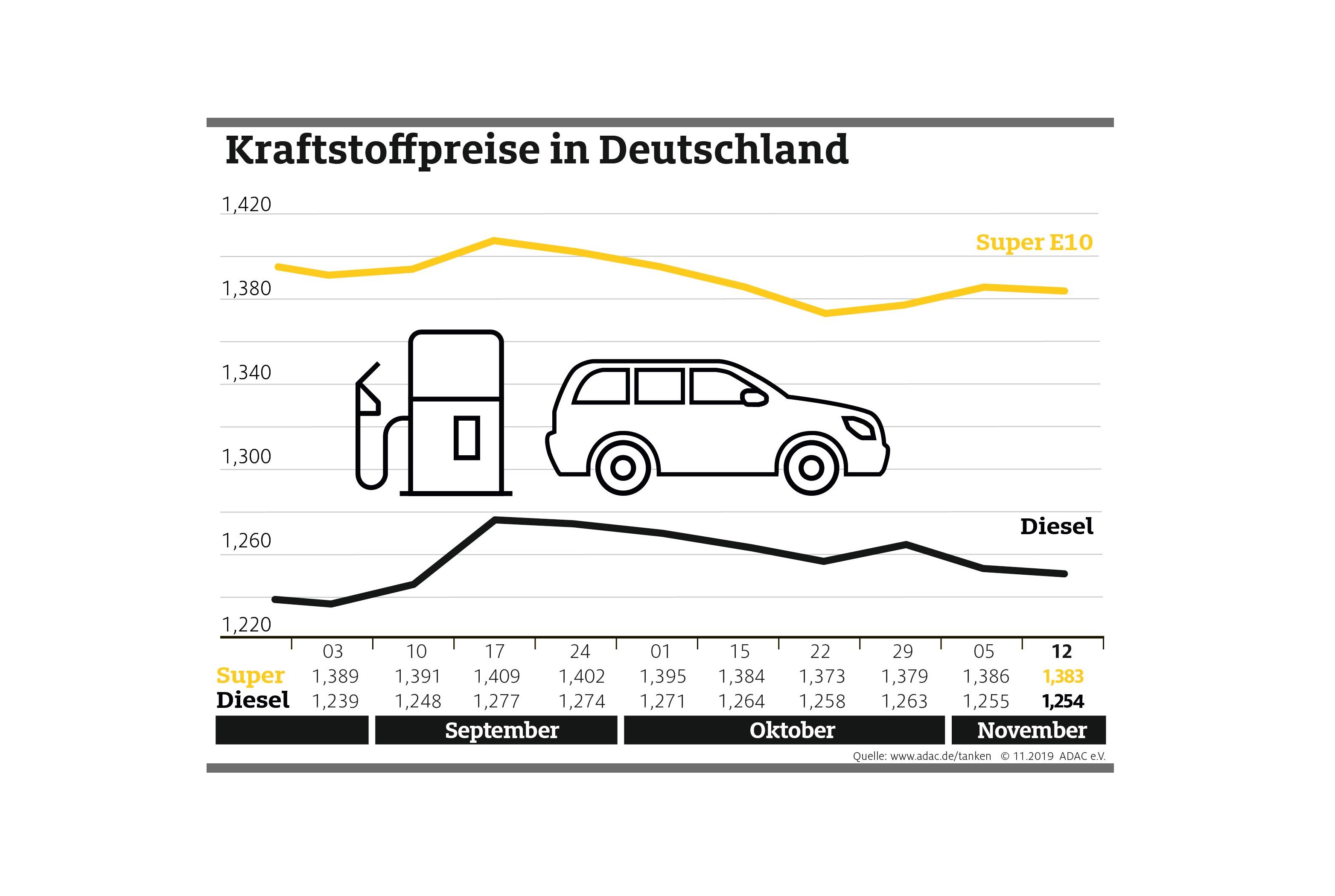 Autofahrer können beim Tanken derzeit auf stabile Preise setzen. Laut Auswertung des ADAC kostet ein Liter Super E10 im Bundesmittel aktuell 1,383 Euro, das sind 0,3 Cent weniger als in der Vorwoche. Diesel verbilligte sich um 0,1 Cent auf durchschnittlich 1,254 Euro je Liter.