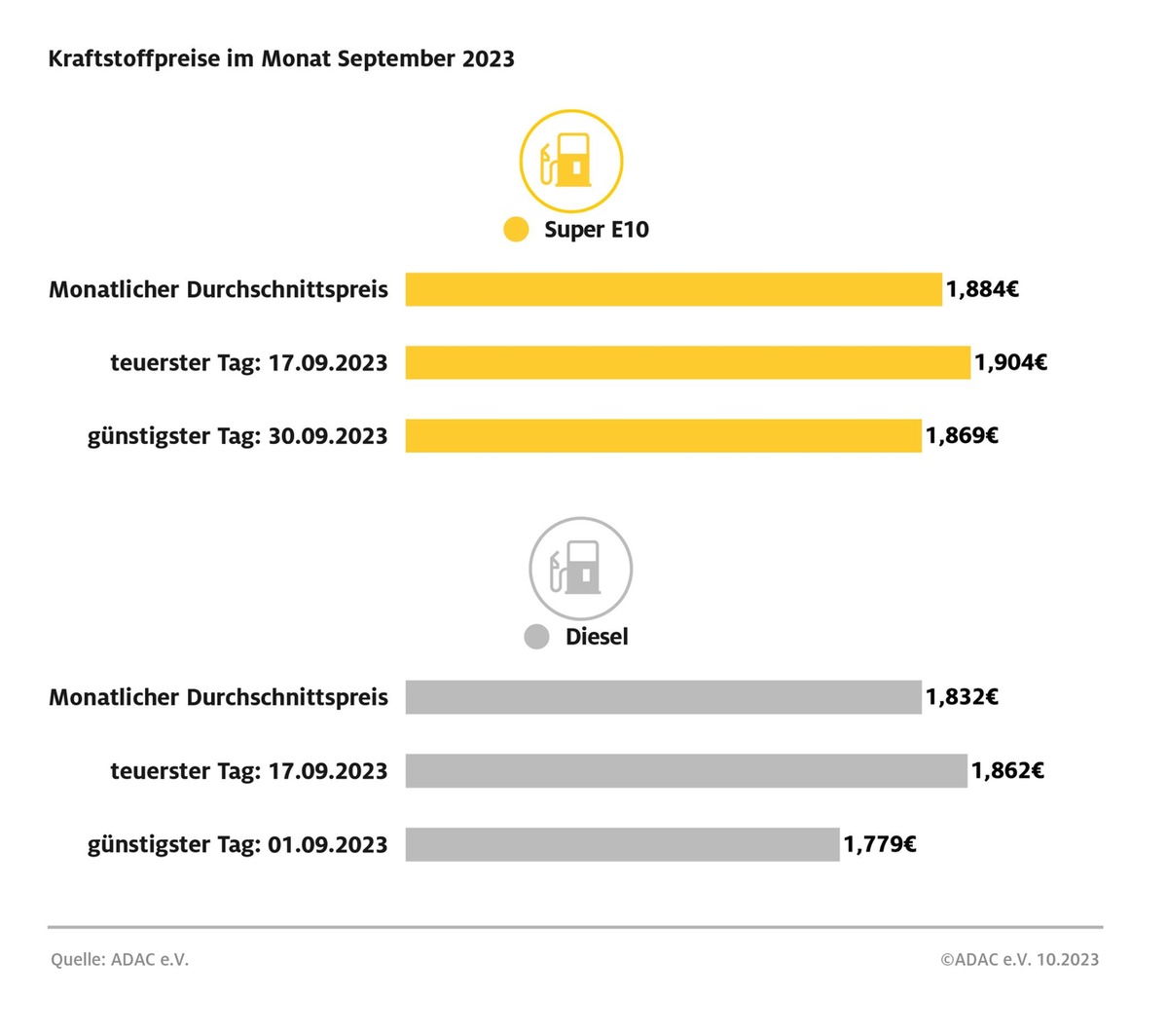 Nachdem im August bereits ein Jahreshöchststand für Super E10 erreicht war, kletterten die Preise für einen Liter im September weiter nach oben. Der neue Jahreshöchststand liegt nun bei 1,884 Euro im Monatsdurchschnitt und damit mehr als zwei Cent höher als im August (1,860 Euro). Der Dieselpreis lag noch deutlicher über dem Vormonatsniveau. Ein Liter kostete im Durchschnitt 1,832 Euro, das sind über sechs Cent mehr (August: 1,766 Euro).