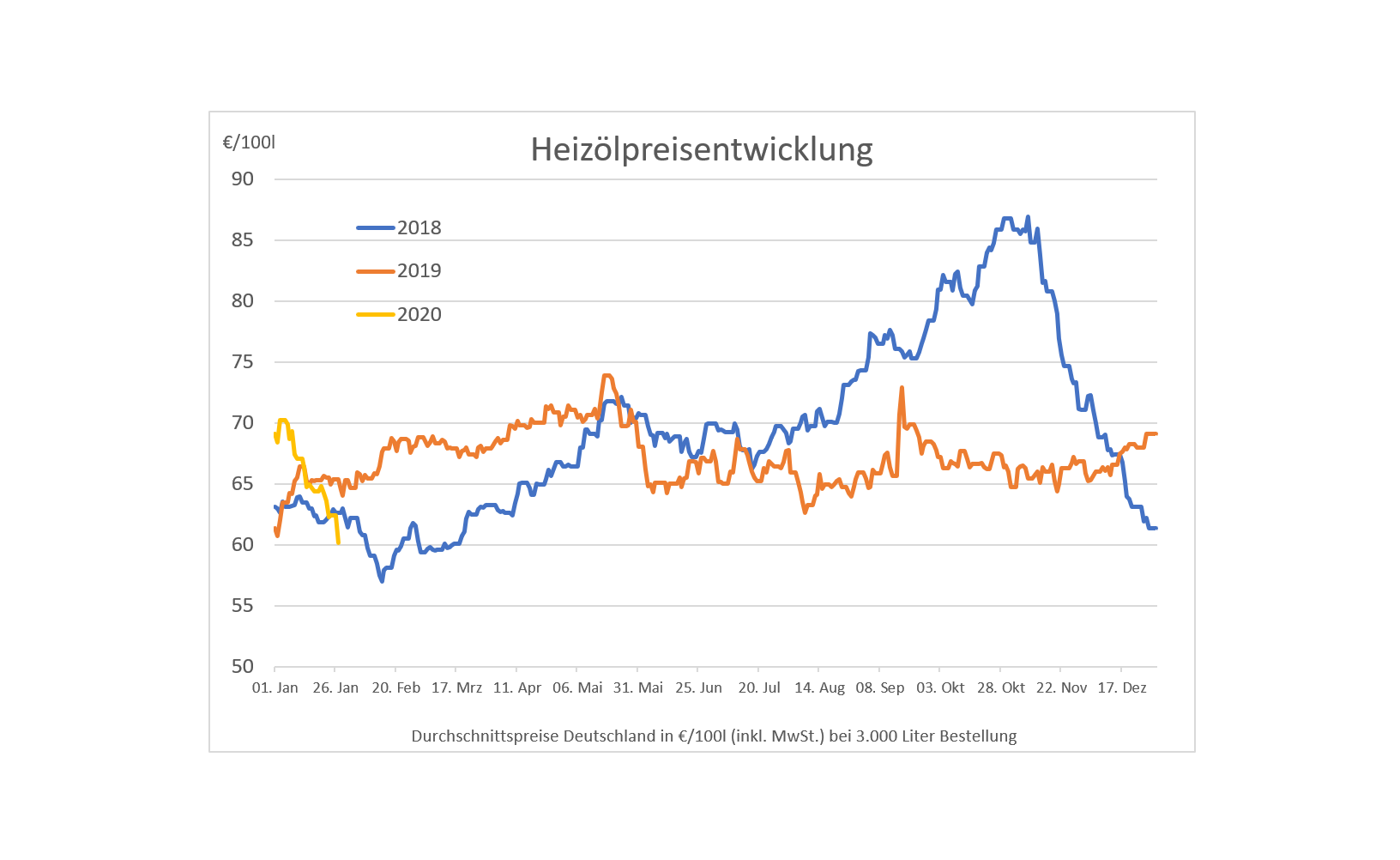 Hinweis: Die genannten Heizölpreise beziehen sich stets auf den deutschlandweiten Durchschnittspreis bei einer Bestellung von 3.000 Liter Heizöl Standard schwefelarm inklusive 19% MwSt.. Durch Transportkosten fallen die Preise regional jedoch unterschiedlich aus. Die Preisspanne zwischen den Regionen kann daher momentan bei bis zu ca. 1,90 Euro pro 100 Liter liegen. Stand der Preise: 27.01.2020