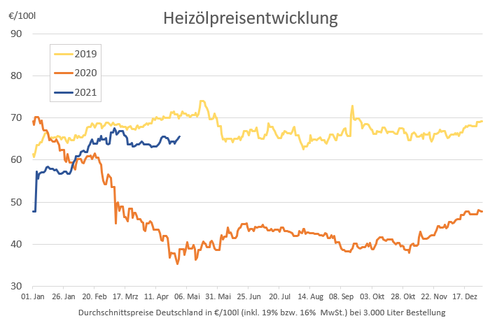 Die genannten Heizölpreise beziehen sich stets auf den deutschlandweiten Durchschnittspreis bei einer Bestellung von 3.000 Liter Heizöl Standard schwefelarm inklusive 19% MwSt. bzw. vom Zeitraum 1.Juli bis 31.Dezember 2020 16% MwSt. Außerdem fallen durch Transportkosten die Preise regional unterschiedlich aus. Die Preisspanne zwischen den Regionen kann daher momentan bei bis zu ca. 1,35 Euro pro 100 Liter liegen. Stand der Preise 30.04.2021