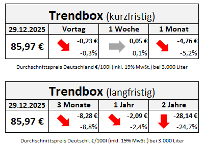 Die genannten Heizölpreise beziehen sich stets auf den deutschlandweiten Durchschnittspreis bei einer Bestellung von 3.000 Liter Heizöl Standard schwefelarm inklusive 19% MwSt. Außerdem fallen durch Transportkosten die Preise regional unterschiedlich aus. Stand der Preise 29.12.2025