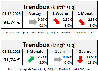 Blicken wir auf die langfristigen Preisentwicklungen, ist Heizöl zum ersten Dezember im Bundesgebiet durchschnittlich +2,23 Euro teurer als Anfang September. Schaut man sich den Heizölpreis des vergangenen Dezemberbeginns an, handeln die Märkte aktuell nahezu identisch zu vor einem Jahr mit einem Unterschied von nur -0,04 Euro. Verglichen mit dem 1. Dezember 2023 sind die Preisrückgänge jedoch weitaus deutlicher, mit -13,97 Euro bzw. -13,2% zum heutigen Heizölpreis.