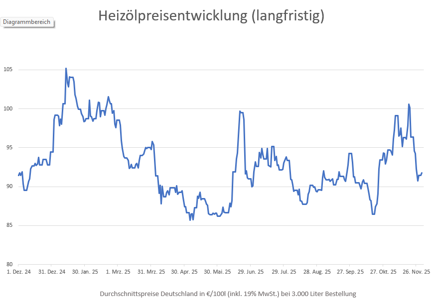 Die genannten Heizölpreise beziehen sich stets auf den deutschlandweiten Durchschnittspreis bei einer Bestellung von 3.000 Liter Heizöl Standard schwefelarm inklusive 19% MwSt. Außerdem fallen durch Transportkosten die Preise regional unterschiedlich aus. Stand der Preise 01.12.2025