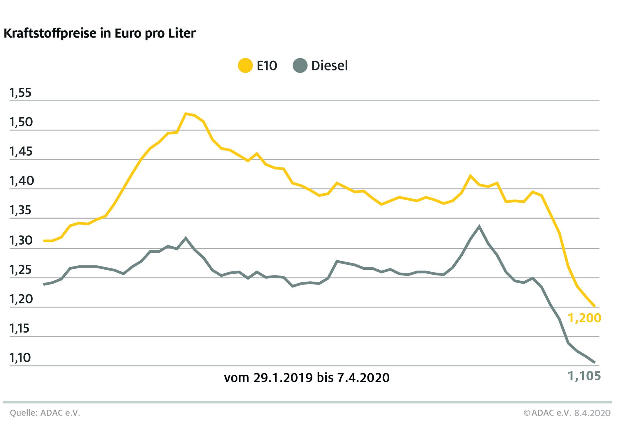 Die weltweite Corona-Krise lässt die Kraftstoffpreise an den Tankstellen weiter fallen. Laut aktueller Auswertung des ADAC müssen Autofahrer für einen Liter Super E10 im Bundesmittel 1,200 Euro bezahlen, das sind 1,7 Cent weniger als in der Vorwoche. Diesel verbilligte sich um 1,0 Cent auf durchschnittlich 1,105 Euro je Liter. Seit Jahresbeginn haben die Spritpreise damit um 23 Cent pro Liter nachgegeben.