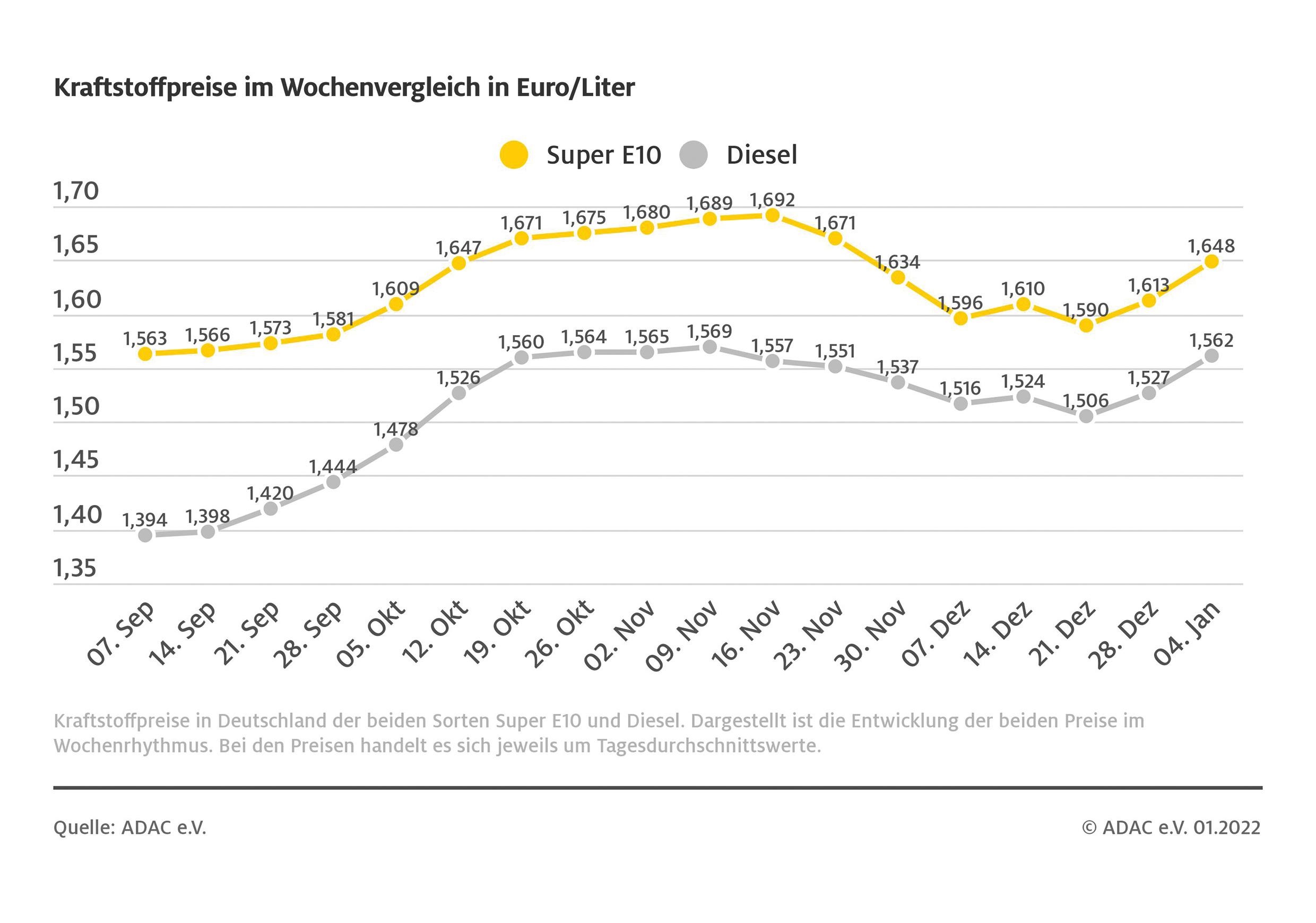 München (ots) – Das neue Jahr startet mit einem Anstieg der Spritpreise. Das ermittelt der ADAC in seinem wöchentlichen Preisvergleich. Demnach kostet ein Liter Super E10 im bundesweiten Mittel 1,648 Euro. Das entspricht einem Anstieg von 3,5 Cent im Vergleich zur Vorwoche. Ein Liter Diesel kostet aktuell an den Zapfsäulen im Bundesschnitt 1,562 Euro – was ebenfalls einen Anstieg von 3,5 Cent im Wochenvergleich bedeutet.